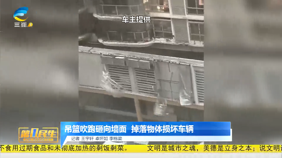 吊篮吹跑砸向墙面 掉落物体损坏车辆